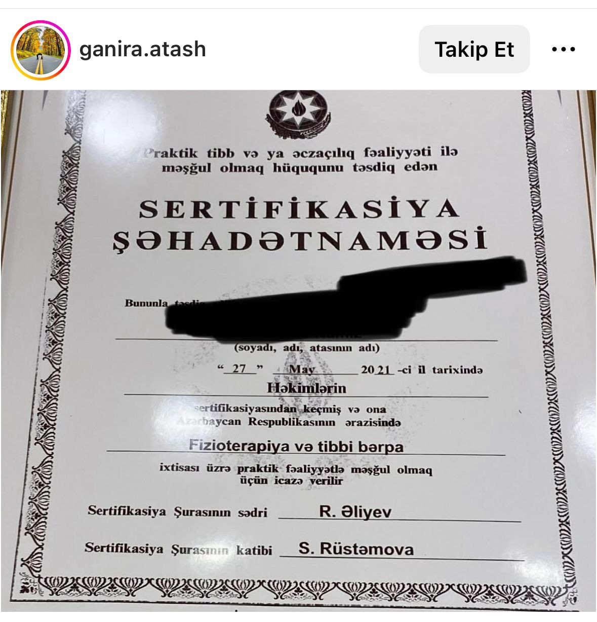 Qənirə Ataşovanın yayımladığı xəbərdə vurğulanırdı ki, Azərbaycanın axsaq səhiyyə sisteminin diqqətinə! Bu sənədin sahibi Azərbaycan Səhiyyə Nazirliyindən həkim-fizioterapevt kimi sertifikat alıb. O, digər tibb universiteti məzunları kimi tam ixtisaslı həkim sertifikatını necə əldə edib? Gəlin, onun təhsil yoluna nəzər salaq: