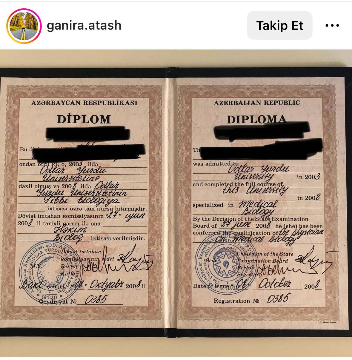 Bir necə gün öncə ABŞ-da yaşayan jurnalist Qənirə Ataşovanın Odlar Yurdu Universitetinin tibbi biologiya ixtisası üzrə bakalavr təhsilini başa vuran şəxsin həkim kimi çalışdığını yazaraq bu həkimə aid diplomları paylaşmışdı. Apardığımız araşdıma zamanı bəlli oldu ki, Qənirə Ataşovanın paylaşdığı diplomlar fizioterapevt və reabilitiloq Rəhimə Atəşə məxsusdur.