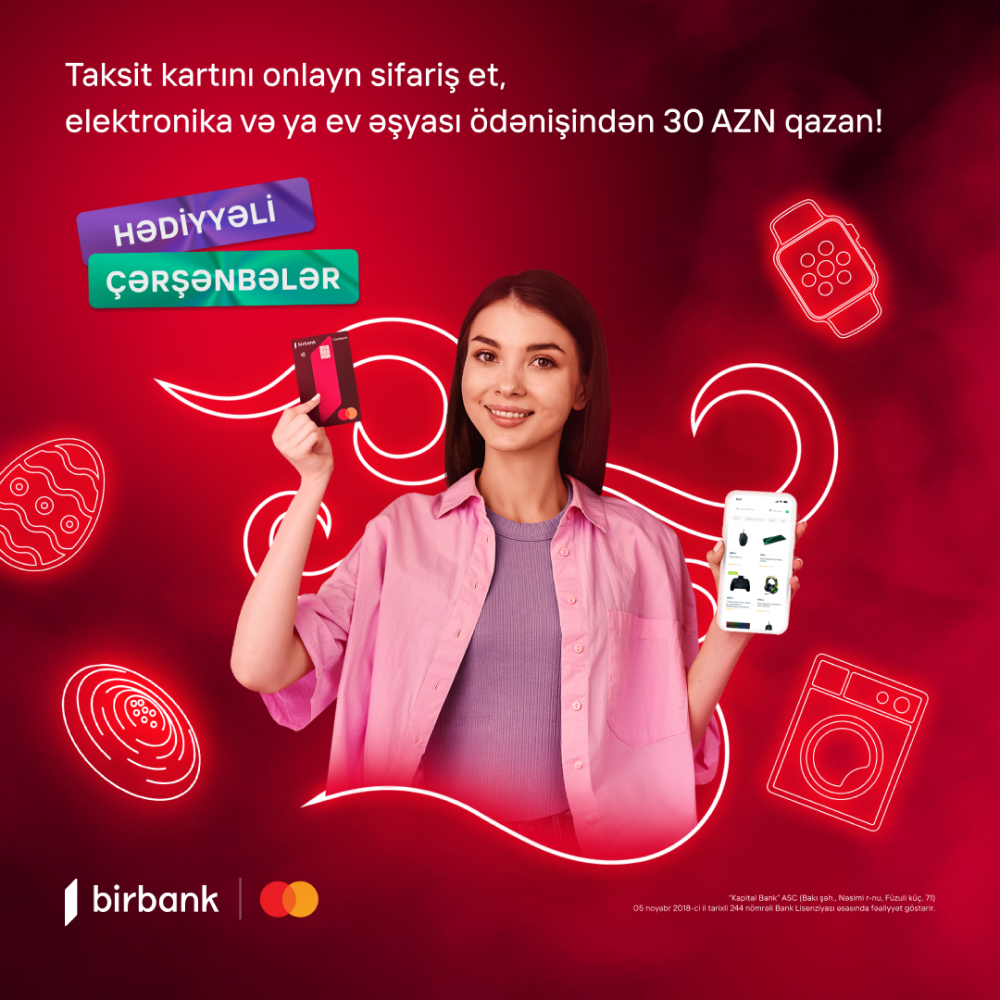 В рамках акции клиенты приобретшие карты рассрочки Birbank Cashback Mastercard онлайн в промежутке между 6-12 марта 2024-го года, совершив свои первые единоразовые безналичные операции до 1го апреля на сумму 100 AZN в категориях «Электроника и товары для дома» получают бонус 30 AZN.
