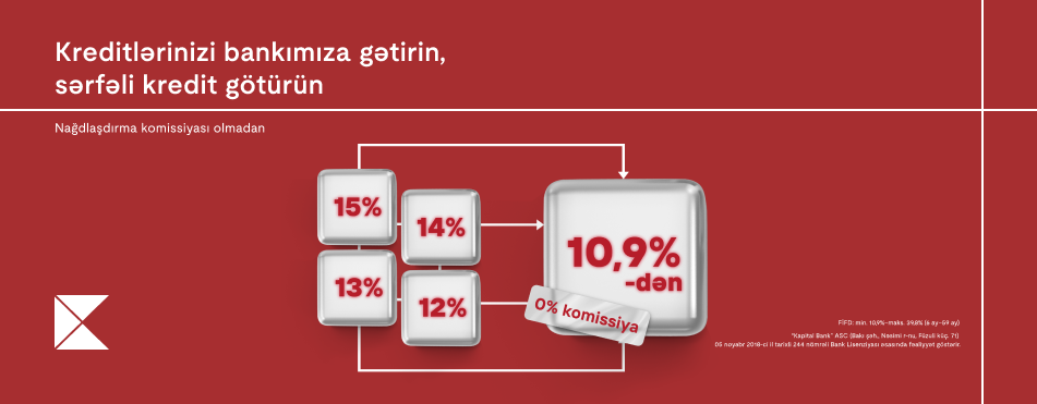 It's time to get rid of high interest rates and paying off loans at multiple places. Customers who obtain a cash loan of up to 50,000 AZN from Kapital Bank under special conditions starting at 10.9% will have the opportunity to reduce interest expenses and lower the amount of monthly payments.